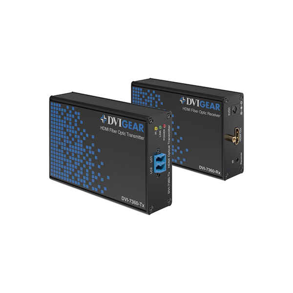 Le DVIGear DVI-7360 est un système de déport fibre optique HDMI 1.4 et DVI 1.0 haut débit compatible HDCP 1.4, capable de distribuer des signaux HDMI ou DVI haute résolution sur des longueurs allant jusqu'à 350 mètres tout en conservant une qualité d'image parfaite. Un signal d'entrée HDMI provenant d'une source tel qu'un décodeur ou un lecteur Blu-Ray est converti en signal optique par un module émetteur pour une transmission LC/LC. Du côté de l'affichage, un module récepteur reconvertit les impulsions optiques en un signal HDMI pour l'affichage sur un moniteur ou un projecteur.